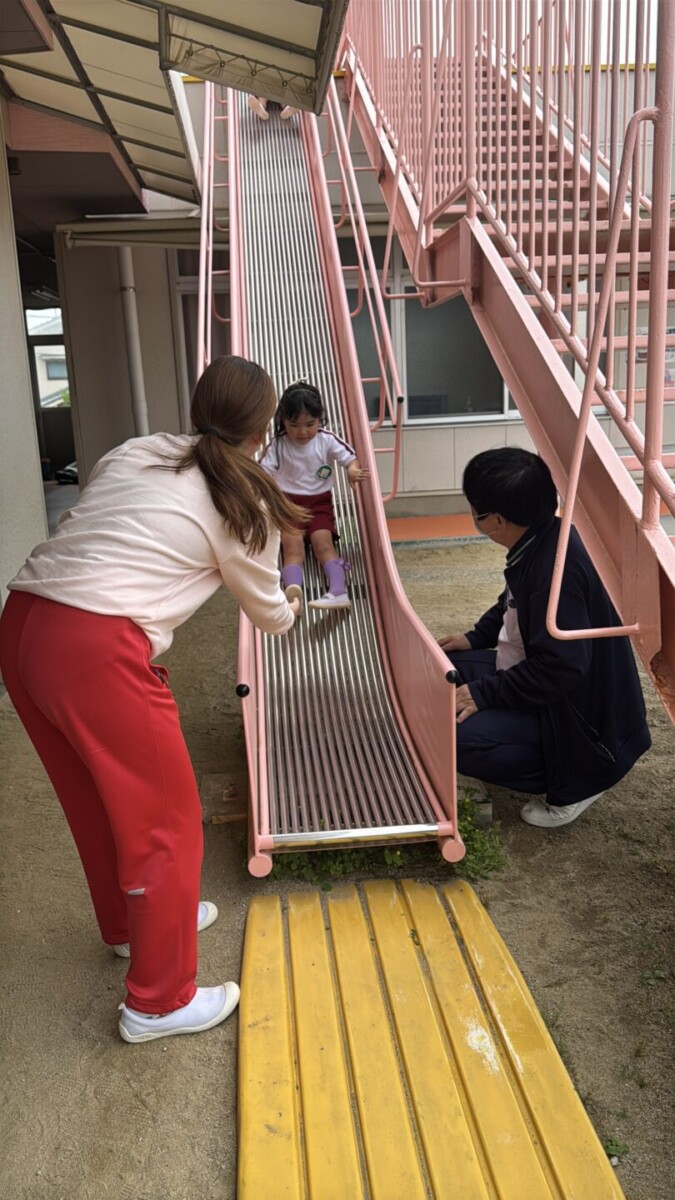 非常用滑り台での避難の練習もしました。